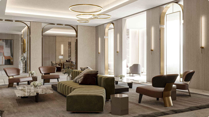 The residences—ranging from stylish apartments to spacious penthouses—are filled with natural light, creating inviting spaces that feel both open and intimate. Every detail reflects luxury, from the high-end finishes to integrated smart home technology, enhancing comfort and everyday living.